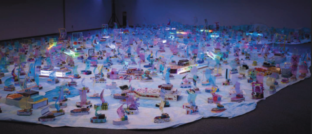 1996年初個展以降、個人の身体感覚によって生み出した小さなカタチを集積させて、展示空間内に架空の風景を表出させる作品を発表。